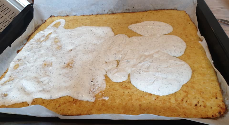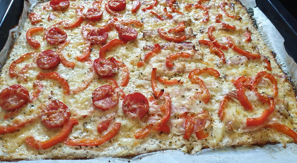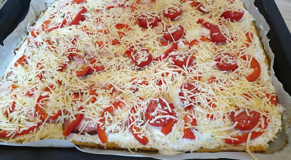 Mit dem Sauerrahm oder Creme fraîche Gemisch bestreichen. Mit Zwiebel, Paprika, Tomaten usw. belegen. Geriebenen Pizza-Käse darüber verteilen und nochmal für ca. 25 Minuten in den Ofen geben.
