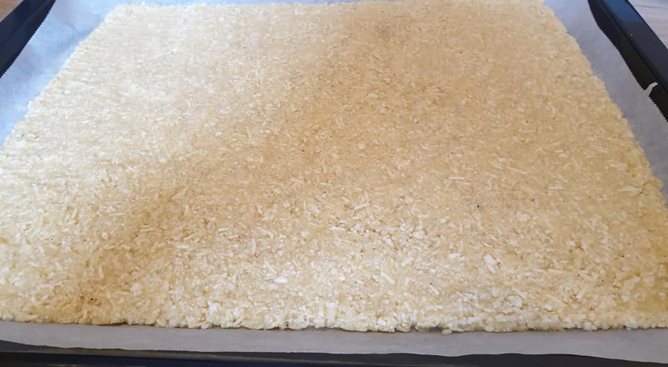 Ca. 500 g fein geraspelter Karfiol (wie Reis ca.) mit 2-3 Eiern und 100 g geriebenem Käse vermischen, salzen und pfeffern und auf einem Backblech mit einer Gabel oder mit den Händen verteilen.